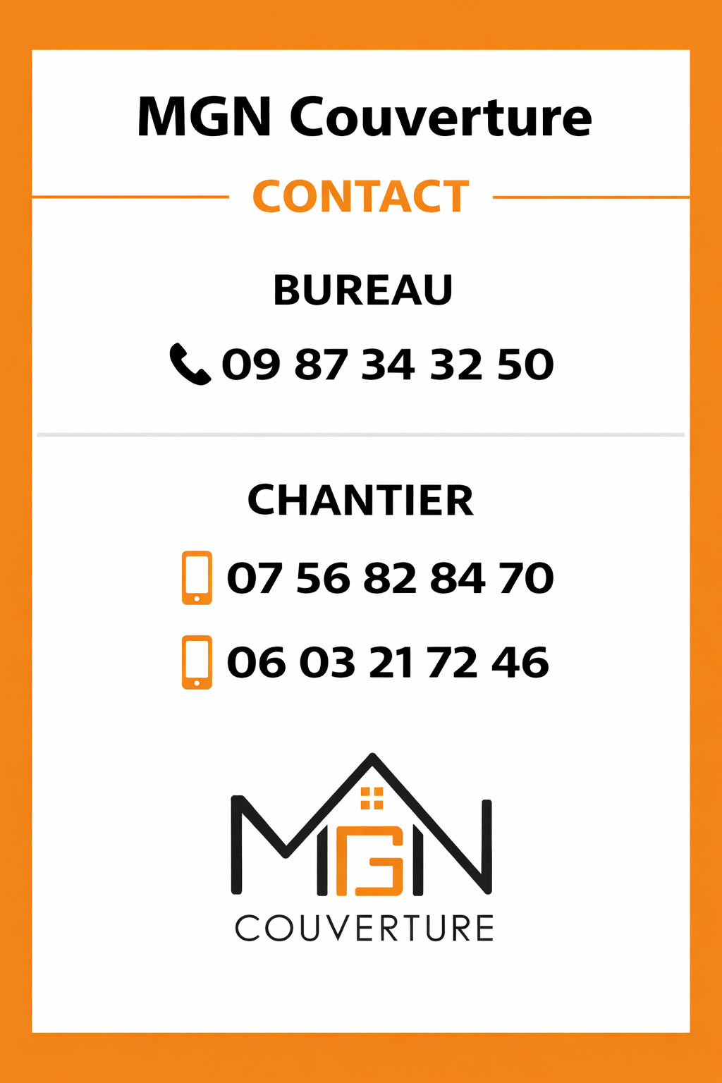 Chez MGN Couverture, nous comprenons l'importance d'une communication rapide et efficace. Contactez-nous dès aujourd'hui pour discuter de vos besoins en matière de couverture et découvrir comment nous pouvons vous aider. Nous sommes fiers de notre réactivité et de notre engagement envers la satisfaction de nos clients. Laissez-nous vous montrer pourquoi tant de personnes nous font confiance pour leurs projets de toiture .